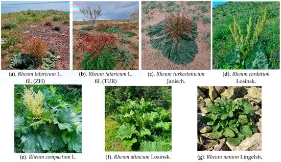 This research was conducted as part of the interdisciplinary scientific programme “Strategy Creation for Conserving and Developing Medicinal and Veterinary Plant Resources in Kazakhstan amid Climate Change”, supported by the Committee of Science of the Ministry of Science and Higher Education of the Republic of Kazakhstan. The plant material analysed in this study comprised herbarium and dried rhizome and leaf samples of potentially medicinal species of the genus Rheum L. (family Polygonaceae) collected from various regions of Kazakhstan. The dataset included Rheum turkestanicum Janisch. (Rh. turkestanicum), Rheum cordatum Losinsk. (Rh. cordatum), and Rheum tataricum L. fil. (Rh. tataricum), which were collected during field expeditions carried out by staff from the Institute of Botany and Phytointroduction (Almaty, Kazakhstan). Additionally, herbarium samples of Rheum compactum L. (Rh. compactum; putative synonym: Rh. altaicum Losinsk.) [83] and Rheum nanum Lingelsh. (Rh. nanum), held at the National Centre for Biotechnology (Astana, Kazakhstan), were included in the analysis.