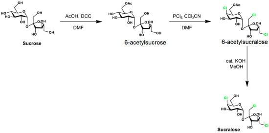 Sucralose is synthetized in food industry from common sugar through several steps (Figure 2).