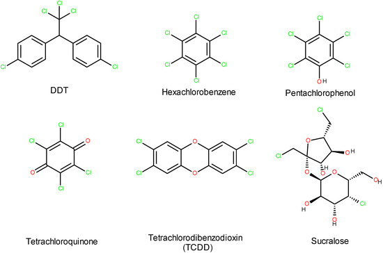 Moreover, as sucralose is nearly not biodegradable, it accumulates in the environment [14,15,16]. Furthermore, when sucralose decomposes thermally or by some bacterial action, it transforms into toxic compounds such as dioxins and tetrachlorodibenzofurans. It should not be forgotten that sucralose is also part of the group of halogen organic compounds (Figure 3).