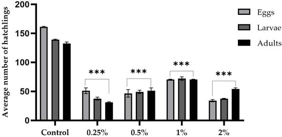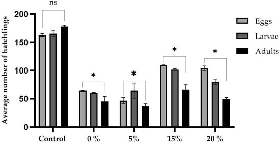 Prolificacy was assessed using a standard culture medium (described in Table 1) supplemented with 0.5% activated charcoal (Sigma-Aldrich, St. Louis, MO, USA). This medium was added to both treatment and control vials as previously described. Following exposure and mating, the numbers of eggs, larvae, and viable adults were recorded. Activated charcoal was added to darken the culture medium, providing contrast that facilitated accurate eggs counting [70,71]. All assays were conducted in triplicate, with three independent replicates of 15 mating vials per group.