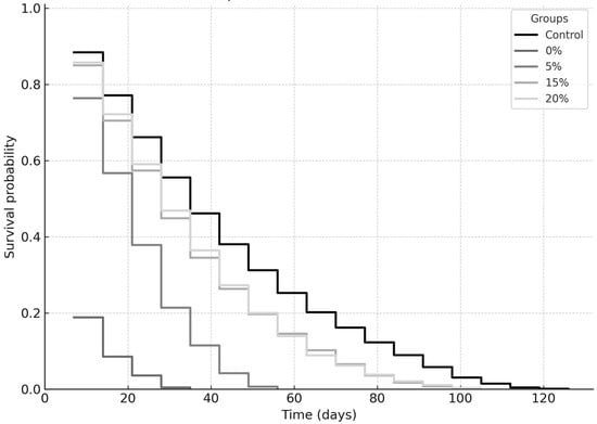 Kaplan–Meier survival curves for Drosophila melanogaster containing different concentrations of sucrose: 0%, 5%, 15%, and 20%, compared to the control group (10% sucrose). The survival probability is plotted over time (days).
