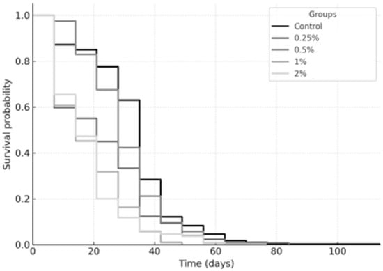 Kaplan–Meier survival curves for Drosophila melanogaster containing sucralose at concentrations of 0.25%, 0.5%, 1%, and 2%, compared to the control group (10% sucrose only). The survival probability is plotted over time (days).