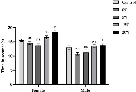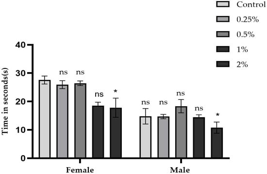 For groups exposed to sucralose (Figure 9), control times were 14.7 s (males) and 27.7 s (females). The 0.25% (14.7 s for males and 25.9 s for females) and 0.5% (18.4 s for males and 26 s for females) concentrations did not statistically differ from the control (p > 0.05). At 1% and 2% concentrations, however, the times were 11.7–14.4 s (males) and 17.8–18.5 s (females), respectively. For the 1% concentration, the difference was statistically significant (p < 0.05), while for the 2% concentration the difference was also significant (p < 0.05).