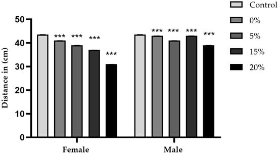Exploration test from cultures containing sugar (sucrose) at concentrations of 0%, 5%, 15%, and 20%, as well as control data. Data are presented as the average distance (in cm) traveled in one minute in a Petri dish, separated by sex and presented as mean ± SD. “An asterisk (***) indicates a statistically significant difference (p < 0.001) compared to the control group”.