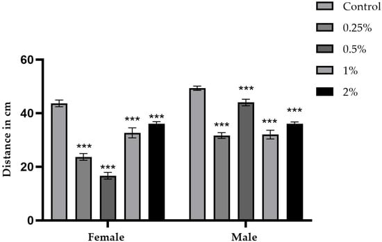 In the sucralose-treated groups (Figure 11), controls covered an average distance of 49 cm for males and 43 cm for females. At the 0.25% concentration, males covered an average distance of 31 cm and females 23 cm. At the 0.5% concentration, males covered an average distance of 44 cm and females 16 cm, compared to the control group. The 0.25% and 0.5% concentrations showed statistically significant differences (p < 0.001). In the 1% and 2% concentrations, values decreased to 32 cm, compared to the control group. The difference was statistically significant in all tested sucralose concentrations, with p < 0.001.