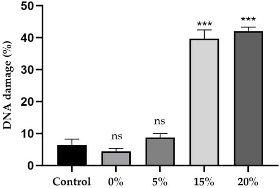 The results of the in vivo comet assay show the percentage of DNA damage in the neuroblasts of larval brains in cultures with 0%, 5%, 15% and 20% sucrose, alongside control data (10%). Data are presented as the mean ± standard deviation (SD). An asterisk (***) indicates a statistically significant difference (p < 0.001) compared to the control group. ‘ns’ indicates no statistically significant difference.