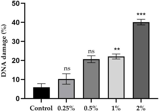 As for sucralose (Figure 13), the control group showed 5.9% damage. Concentrations of 0.25% and 0.5% resulted in 10.5% and 20% damage, respectively (p > 0.05). However, damage increased substantially to 22% and 40%, respectively, at concentrations of 1% and 2% (p < 0.001), indicating sucralose’s high genotoxicity at concentrations above 0.5%.