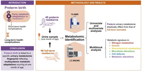 - Diaz, S.O.; Pinto, J.; Barros, A.S.; Morais, E.; Duarte, D.; Negrao, F.; Pita, C.; Almeida, M.D.C.; Carreira, I.M.; Spraul, M.; et al. Newborn Urinary Metabolic Signatures of Prematurity and Other Disorders: A Case Control Study. J. Proteome Res. 2016, 15, 311–325. [Google Scholar] [CrossRef] [PubMed]