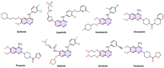 12. Zhang, Y.; Wang, P.; Hu, D.; Jin, L.; Yang, S. Research Progress on Quinazoline Derivatives with Epidermal Growth Factor Receptor Inhibiting Bioactivity. Chin. J. Org. Chem. 2012, 32, 444. [Google Scholar] [CrossRef]