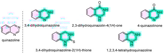 Quinazoline derivatives, a fascinating class of compounds known for their diverse biological activities, are generally categorized into several key types: 3,4-dihydroquinazoline [28,29], 2,3-dihydroquinazolin-4(1H)-one [30,31,32], 4-quinazolinone [33,34,35,36], 3,4-dihydroquinazoline-2(1H)-thione [37,38], and 1,2,3,4-tetrahydroquinazoline [39,40], which are seen in Figure 2. The synthetic innovations associated with these categories have significantly broadened their applicability, allowing for the creation of novel compounds specifically designed to meet various therapeutic needs.