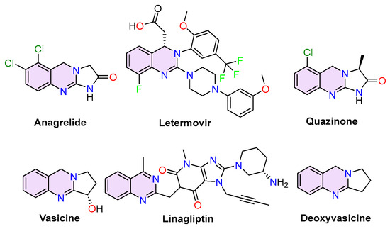 3,4-Dihydroquinazoline-based compounds have garnered significant attention in both natural product chemistry and pharmaceutical research due to their diverse biological activities and therapeutic potential, such Anagrelide, Letermovir, Quazinone, Vasicine, Linagliptin and Deoxyvasicine (Figure 3). The presence of the 3,4-dihydroquinazoline core in natural products and marketed drugs often contributes to their unique mechanisms of action and biological efficacy, making them valuable leads in drug discovery [28,29,54,55].