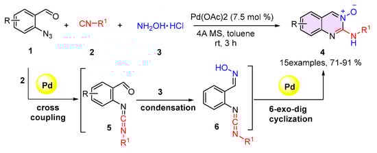Quinazoline serves as a crucial pharmacophore in drug discovery. Numerous substituted quinazoline derivatives exhibit remarkable bioactivities, with some having received approval from the Food and Drug Administration (FDA) for clinical use (Figure 1) [42]. An example of synthesizing quinazoline 3-oxides 4 can be found in the Pd(II)-catalyzed three-component reaction (3-CR) involving 2-azidobenzaldehyde 1, isocyanide 2, and hydroxylamine hydrochloride 3 in a one-pot procedure reported by the Sawant group (Scheme 1) [43]. This approach offers significant advantages over traditional methods, which typically rely on prefabricated substrates generated through multistep syntheses. Conventional techniques often suffer from drawbacks such as low yields, harsh reaction conditions, limited substrate scope, and the use of expensive starting materials [44,45,46,47]. In contrast, the Pd(II)-catalyzed strategy provides a more efficient and streamlined pathway to quinazoline 3-oxides 4 with 15 examples in the range of 71–91%.