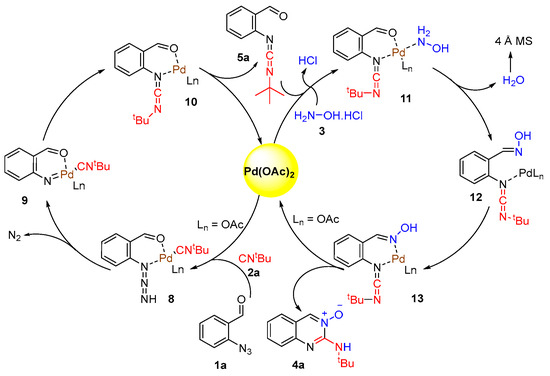 In general, isocyanides are highly versatile chemicals that enable the rapid assembly of complex molecules. However, their characteristic odor and toxicity, as well as their tendency to undergo undesired side reactions under harsh conditions, require careful handling and consideration of such environmental impact, regioselectivity, and scalability in synthetic applications [48]. Thus, for the validation of mechanistic pathways, authors confirmed that 3-CR proceeds predominantly through the generation of compounds 5 and 6, involving the azide–isocyanide denitrogenative coupling/condensation/6-exo-dig cyclization by a series of control experiments, and denied a pathway via compound 7a (Scheme 2). Pd(II)-catalyzed mechanism was proposed in Scheme 3; initially, coordination of 2-azidobenzaldehyde 1a and isocyanide 2a with Pd(OAc)2 generates intermediate 8 in mild conditions. This intermediate undergoes nitrogen extrusion to form nitrene intermediate 9. Subsequently, intramolecular isocyanide transfer over the nitrene occurs in a concerted manner, yielding carbodiimide 5a. This reactive carbodiimide then enters the second catalytic cycle, coordinating with palladium metal. During this cycle, the aldehydic functional group of 5a condenses with hydroxylamine 3, resulting in the loss of a water molecule that is trapped by 4 Å molecular sieves. This condensation furnishes hydrazone 12, which subsequently undergoes 6-exo-dig cyclization to produce quinazoline-3-oxide 4a.