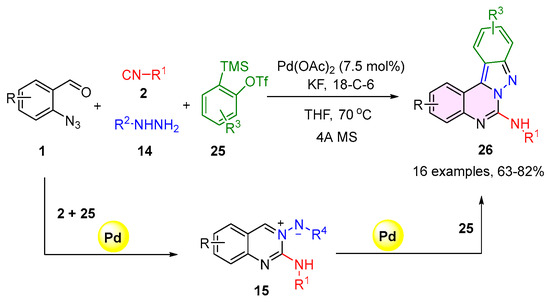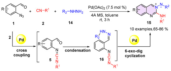 Quinazoline-derived azomethine imines (QAIs) have emerged as a compelling class of compounds in this field due to their high reactivity. These QAIs, based on the quinazoline scaffold, can effectively serve as 1,3-dipoles in cycloaddition or formal cycloaddition reactions [49]. This enables the construction of diverse quinazoline-fused polycyclic compounds, highlighting their versatility and potential in synthetic chemistry. Compared to traditional methods that rely on a three-step process involving 2-nitrobenzaldehyde for the preparation of functional azomethine imines 15 [50,51,52]. The Sawant group has developed a more practical approach. They reported a Pd-catalyzed three-component reaction (3-CR) protocol using 2-azidobenzaldehyde 1, tert-butyl isocyanide 2, and sulfonyl hydrazide 14 in tetrahydrofuran to synthesize tert-butylamino-substituted azomethine imines 15 in 65–86% yield (Scheme 4) [53]. This 3-CR method via cross-coupling/condensation/condensation/6-exo-dig cyclization is more efficient in terms of operational simplicity and effectiveness, despite the presence of a substituent on the pyrimidine ring.