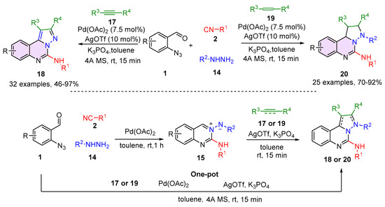 Among these efforts, the Sawant group reported a series of innovative syntheses of 3,4-dihydroquinazoline derivatives, enabled by 2-azidobenzaldehyde and executed through a four-component reaction (4-CR). This process involves the generation of azomethine imines 15, followed by a 1,3-dipolar cycloaddition to drive the diversity-oriented synthesis (DOS) [65,66] of 3,4-dihydroquinazoline derivatives, providing the means to explore uncharted chemical and biological spaces, ultimately driving forward the discovery of new and effective therapeutics. Initially, they demonstrated a 4-CR using four versatile privileged synthons: 2-azidobenzaldehyde 1, isocyanide 2, sulfonyl hydrazide 14a, and alkynes 17. This reaction, promoted by the transition metal catalysts Pd(OAc)2 and AgOTf, yielded pyrazolo[1,5-c]quinazolines 18 (Scheme 5) [67]. The 4-CR process efficiently generates five new chemical bonds, producing diverse compounds 18, with 32 examples yielding between 46 and 97% in a single operation. Moreover, substituting alkynes 17 replaced by electron-deficient alkenes 19, such as acrylates and acrylonitrile, facilitates the one-step synthesis of tetrahydropyrazolo[1,5-c]quinazolines 20. This 4-CR mechanism was validated through a stepwise synthetic process, demonstrating that azomethine imines 15 was formed via the azide–isocyanide denitrogenative coupling, condensation, and 6-exo-dig cyclization, then followed by 1,3-dipolar cycloaddition to yield compounds 18 and 20. These powerful molecules underwent cell viability assays, revealing excellent cytotoxic effects and strong inhibition of EGFR, with docking studies highlighting hydrogen bonding interactions with key amino acid residues, namely Met769, Glu738, and Thr766 [67].