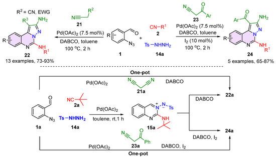 Subsequently, the Sawant group investigated the scalability of 4-CR using 1,3-dipolar cycloadditions of azomethine imines 15, employing various dipolarophiles in a one-pot approach. Authors synthesized azomethine imines 15a from a 3-CR of 2-azidobenzaldehydes 1, isocyanides 2, and tosyl hydrazides 14a. These were then used to produce pyrazolo[1,5-c]quinazolines 22 and 24 by incorporating dipolarophiles like 21 and 23 in the 1,3-dipolar cycloaddition process (Scheme 6) [68]. Furthermore, one-pot two-step reaction conditions were optimized using 1,4-diazabicyclo[2.2.2]octane (DABCO) and DABCO/I2 under palladium catalysis at 100 °C for 2 h, yielding compounds 22 with 13 examples ranging from 73 to 93%, and compounds 24 with 5 examples, yielding between 65 and 87%.