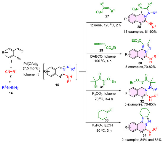 Additionally, a Pd-catalyzed 4-CR involving 2-azidobenzaldehyde 1, isocyanides 2, sulfonyl hydrazides 14, and 2-(trimethylsilyl)-phenyltriflates 25, the latter serving as an aryne precursor, was explored for the cascade synthesis of fluorescent indazolo[2,3-c]quinazolines 26 (Scheme 7) [69]. This resulted in 16 examples with yields between 63 and 82%. These compounds demonstrated absorption in the visible region, high quantum yield fluorescence, and excellent photostability. This cascade 4-CR encompasses three sequential transformations: (1) palladium-catalyzed formation of azomethine imine; (2) cyclocondensation with hydrazides; and (3) carboamination of aryne [70]. Azomethine imines 15 were synthesized by 3-CR in hand; the Sawant group further explored diverse one-pot 4-componet synthesis by offering nitroolefins 27 and allenoates 29 as dipolarophiles to make 1-nitro-2-aryl-1,2,3,10b-tetrahydropyrazolo[1,5-c]quinazolines 28 and 2-methylpyrazolo[1,5-c]quinazolines 30 in medium yields, respectively (Scheme 8) [53]. This 4-CR was also offered in the DOS of compounds 32 and 34 through using α-halo hydroxamates 31 and cyclic ketones 33 reacting with versatile azomethine imines 15 (Scheme 8).