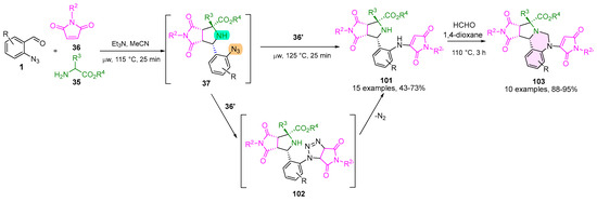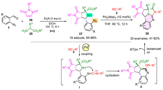 DOS is a strategic approach in organic synthesis designed to explore novel reaction pathways. It plays a crucial role in drug discovery by generating structurally diverse compounds, thereby identifying potential molecules with a wide range of biological activities [53,65,66]. Zhang group exemplified this approach by using 2-azidobenzaldehyde 1 to promote 1,3-dipolar cycloaddition with amino esters 35 and maleimides 36, resulting in versatile pyrrolidine adducts 37. These adducts contain dual functional NH and N3 groups, enabling a range of DOS applications through various reaction pathways. Notable pathways include click chemistry, radical reactions, and Staudinger/aza-Wittig reactions, which effectively connect the NH and N3 groups and expand the diversity of the resulting compounds [71,72]. Recently, Ma and colleagues reported a cascade reaction process through Pd-catalyzed azide–isocyanide coupling/cyclization/lactamization reactions using dual functional intermediates 37 for the synthesis of tricyclic guanidine-containing polyheterocycles 38 with 30 examples in the scale of 47–82% yields (Scheme 9) [73].