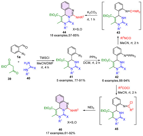 In 2010, Ding group reported a stepwise Biginelli/Staudinger/aza-Wittig process to construct 3,4-dihydroquinazoline derivatives, which involves the preparation of dual functional adducts 41 by 3-CR with 2-azidobenzaldehyde 1a, ethyl acetoacetate 39, and urea 40, followed by one-pot Staudinger and aza-Wittig reactions to give carbodiimides 43 without the isolation of iminophosphoranes 42, then cyclized easily to afford pyrimido[1,6-c]quinazolin-4-ones 44 in moderate to good overall yields in the presence of catalytic amount of potassium carbonate in acetonitrile (CH3CN) at room temperature (Scheme 10) [74]. This strategy was also applied to make compounds 46 with 17 examples in the scale of 61–92% yields by the reaction of iminophosphoranes 42 with acyl chloride.