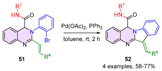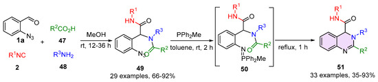 Ding group reported a second example of 3,4-dihydroquinazoline synthesis using an Ugi/Staudinger/aza-Wittig sequence. This method produced 33 examples of compound 51 with yields ranging from 35% to 93%. Initially, adducts 49 were synthesized with yields of 66% to 92% through a 4-CR (Ugi) involving substrates 1a, 2, 47, and 48. This was followed by a one-pot Staudinger/aza-Wittig process, as depicted in Scheme 11 [64]. Some of the products 51 with dual functional sites prepared by Ugi reaction of 2-bromobenzenamine 48a, cinnamic acids 47, 2-azidobenzaldehyde 1a, and isocyanide 2, could be implemented in an intramolecular Heck cyclization under Pd-catalysis to give tetracyclic 3,4-dihydroquinazolines 52 with four cases in the range of 58–77% yield (Scheme 12) [64].