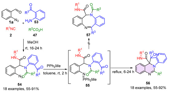 Furthermore, the Ding group explored the DOS of the Ugi/Staudinger/aza-Wittig sequence using a variety of substrates in a stepwise manner. They reported a third example for the synthesis of indolo[1,2-c]quinazolines 56, achieving 18 examples with yields ranging from 55% to 92% (Scheme 13) [75]. The synthesis utilized 2-acylaniline 53 in an Ugi 4-CR. Under the experimental conditions, benzodiazocine 57 was not detected; instead, indolo[1,2-c]quinazoline 56 was obtained. This outcome is likely attributed to the restricted conformation of iminophosphorane 55, which may be entropically unfavorable for cyclization between the iminophosphorane moiety and the ketone carbonyl group.