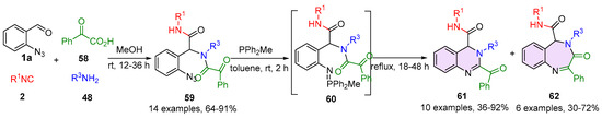 Similar to last case for compound 56, authors developed a DOS example by using benzoylformic acid 58 in Ugi reaction to synthesize multi-functional intermediates 59 with 14 examples ranging from 64% to 91%, then followed by a one-pot Staudinger/aza-Wittig approach to produce 2-acylquinazolines 61 (10 examples, 36–92%) and/or 3H-1,4-benzodiazepin-3-ones 62 (6 examples, 36–92%) in Scheme 14 [76].