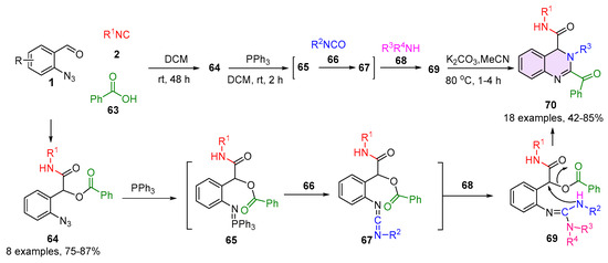 Additionally, the Ding group reported a synthesis sequence involving Passerini/Staudinger/aza-Wittig/addition/nucleophilic substitution reactions to produce 3,4-dihydroquinazolines 70. This sequence begins with the synthesis of azides 64, yielding 8 examples with yields ranging from 75% to 87% via a three-component Passerini reaction. The azides were then reacted with PPh3 and phenyl isocyanates 66 through Staudinger/aza-Wittig reactions to generate carbodiimides 67. These compounds were subsequently treated with diethylamines 68 to form guanidine intermediates 69. Finally, under reflux in CH3CN with K2CO3, 18 examples of 3,4-dihydroquinazolines 70 were obtained with yields between 42% and 85%, as illustrated in Scheme 15 [77].