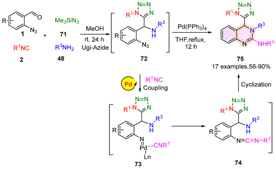 Yao and Zhu group reported a novel approach to follow a four-component reaction of Ugi-azide for making intermediates 72 with dual functional sites involving NH and azide groups, then implemented the one-pot synthesis of 3,4-dihydroquinazolines 75 with 17 examples in the range of 56–90% by Pd-catalyzed azide–isocyanide coupling and cyclization (Scheme 16) [63].