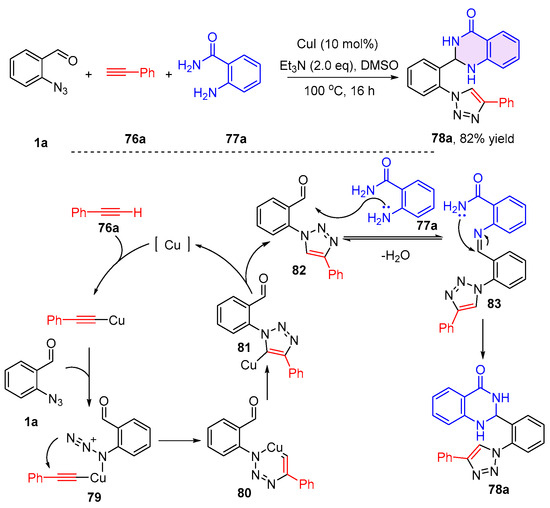 The synthesis of 2,3-dihydroquinazolin-4(1H)-one typically involves the condensation of anthranilic acid derivatives with carbonyl compounds such as aldehydes or ketones. This process often utilizes catalysts, which can include Lewis acids or Bronsted acids, to promote the cyclization and formation of the quinazolinone core [78,79,80]. In another approach, isatoic anhydride is reacted with amines in the presence of a suitable reagent to yield the target compound. The synthesis can be adjusted to incorporate various substituents on the quinazolinone scaffold, allowing for the exploration of its diverse chemical space [81,82]. In addition, the Alves group reported a three-component reaction with 2-azidobenzaldehyde 1a, phenylacetylene 76a, and anthranilamide 77a to make triazoyl-2,3-dihydroquinazolinone 78a isolated in 82% yield, which was characterized by high- and low-resolution mass spectrometry, 1H and 13C NMR analysis. This Cu-catalyzed mechanism for making 78a in dimethyl sulfoxide (DMSO) was proposed: click chemistry with 76a and azide group of 2-azidobenzaldehyde 1a was completed to give triazole 82, and followed by an intramolecular cyclization reaction after a nucleophilic attack from the amide nitrogen 82a to the imine carbon 83 (Scheme 17) [83]. They also explored this 3-CR to make heterocycles 85 with 17 examples ranging from 34% to 98% yield, and compounds 87 with 15 examples in the scale of 17–98% through using diamine 84a and thiourea 86a instead of 77a, respectively (Scheme 18) [84,85].