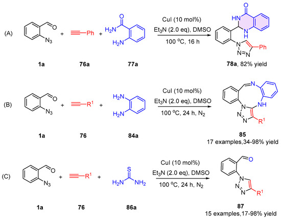 84. Peringer, F.; Nascimento, J.E.R.d.; Abib, P.B.; Barcellos, T.; der Eycken, E.V.V.; Perin, G.; Jacob, R.G.; Alves, D. Copper-Catalyzed Multicomponent Reactions: Synthesis of Fused 1,2,3-Triazolo-1,3,6-triazonines. Eur. J. Org. Chem. 2017, 2017, 2579–2586. [Google Scholar] [CrossRef]