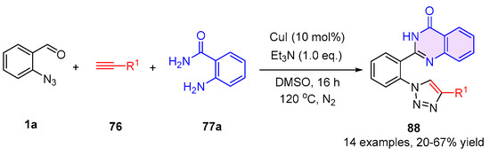 Furthermore, similar to 3,4-dihydroquinazolines in biological interests, the versatility of the 4-quinazolinone scaffold allows for varied structural modifications to enhance efficacy and specificity, contributing to its continued interest and exploration in drug discovery (Figure 5). The construction of 4-quinazolinone typically involves cyclization of anthranilic acid or isatoic anhydride [79,81,86]. Based on the Cu-catalyzed synthesis of 3,4-dihydroquinazolines 78a, the Alves group further offered optimal reaction conditions involving 3-CR of with 2-azidobenzaldehyde 1a, phenylacetylene 76a, and anthranilamide 77a to synthesize 4-quinazolinones 88 with 14 examples ranging from 20% to 67% yield via in situ aromatic oxidation (Scheme 19) [83].