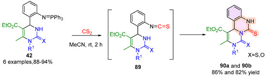 Ding and co-workers developed a Biginelli/Staudinger/aza-Wittig sequence to make 3,4-dihydroquinazolines 44 and 46 (Scheme 10) involving a stepwise synthesis of intermediates 42 by Biginelli/Staudinger process. This strategy also facilitates making 3,4-dihydroquinazoline-2(1H)-thiones 90a and 90b with 82% and 86% yield through 42 reacting with carbon disulfide (CS2) in aza-Wittig reaction, illustrated in Scheme 20 [74].
