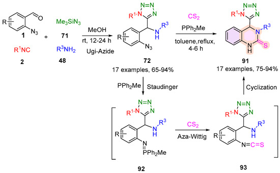 Similar to one-pot sequential Ugi–azide/Pd-catalyzed azide–isocyanide cross-coupling/cyclization reaction to make 3,4-dihydroquinazolines 75 in Scheme 15, Ding group also developed a sequential Ugi–azide/Staudinger/aza-Wittig/cyclization reaction to accomplish the stepwise synthesis of 3,4-dihydroquinazoline-2(1H)-thiones 91 with 17 examples ranging from 75% to 94% yield. The whole reaction process underwent Ugi–azide 4-CR to give intermediate 72, then followed by Staudinger reaction to provide compounds 92, and aza-Wittig reaction reacting with CS2 to obtain adducts 93, finally afforded compounds 91 via cyclization (Scheme 21) [92]. Generally, the synthesis of 3,4-dihydroquinazoline-2(1H)-thiones using CS2 suffers from challenges in toxicity, volatility, flammability, handling, and storage difficulties; it is essential to have an insight into human health and environmental hazard [93].