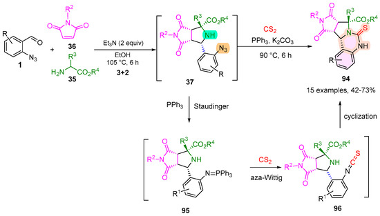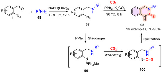 Furthermore, the Zhang group reported two examples of synthesizing 3,4-dihydroquinazoline-2(1H)-thiones using carbon disulfide (CS2) through a sequential Staudinger/aza-Wittig/cyclization reaction. The initial example was accomplished via a one-pot process involving a 1,3-dipolar cycloaddition, followed by Staudinger, aza-Wittig, and cyclization reactions. Specifically, intermediate 37 was derived from a three-component [3+2] cycloaddition involving 2-azidobenzaldehyde 1, amino esters 35, and maleimides 36 as substrates. This was subsequently followed by Staudinger/aza-Wittig/cyclization reactions without the need for intermediate purification, successfully yielding the 3,4-dihydroquinazoline-2(1H)-thione 94 across 15 examples, with yields ranging from 42% to 73% (Scheme 22) [94]. Recently, they developed the second case to make 3,4-dihydroquinazoline-2(1H)-thiones 98 with 16 examples in the scale of 70–93% yield via a one-pot reductive amination/ Staudinger/aza-Wittig/cyclization reaction (Scheme 23) [95].