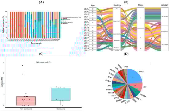 Molecular and clinicopathological overview of testicular germ cell tumors (TGCTs) in a real-world cohort (n = 27). (A) Histological subtype distribution across the cohort. Bar plot showing the number of patients diagnosed with TGCTs. Histology was based on pathology review of orchiectomy and/or RPLND specimens. TGCT-20 is a pre-pubertal type teratoma (well-differentiated neuroendocrine tumor) (B) Alluvial plot integrating clinicopathological features. This visualization depicts the relationship among multiple variables for each patient, including sample ID, patient age, histology (seminoma vs. non-seminoma), clinical stage (I, II, III), and whether retroperitoneal lymph node dissection (RPLND) was performed. This integrative view highlights histologic and clinical heterogeneity across the cohort. (C) Tumor Mutational Burden (TMB) stratified by histology. Boxplot showing the distribution of TMB (mutations per megabase) for seminomas versus non-seminomas. Median TMB for the entire cohort was 0.5 mutations/Mb, reflecting the overall low mutation rate in TGCTs. The Wilcoxon rank-sum test showed no significant difference between the two histologic subgroups (p = 0.15). (D) Prevalence of actionable somatic alterations. Bar chart illustrating the number of tumors harboring recurrent cancer-related mutations identified through targeted sequencing. The most frequently altered genes included KRAS, KIT, and PIK3CB. Only genes with at least two altered cases are shown. These alterations include both single-nucleotide variants and copy number changes with potential clinical significance based on NCCN and OncoKB databases. EC: Embryonal carcinoma. TGCT-1: seminoma with large amount of syncytiotrophoblast.