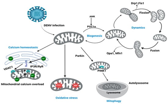 DENV alters mitochondrial dynamics, biogenesis, calcium homeostasis, and mitophagy. DENV induces disruptions in calcium homeostasis by promoting calcium influx via VDAC1 and IP3R/RyR channels, enhancing mitochondrial calcium overload. Mitochondrial biogenesis is dominated through AMPK/PGC1α downregulation; at the same time, mitochondrial dynamics are altered via disproportional fission (Drp1, Fis1) and fusion (OPA1, Mfn1) processes. Further, damaged mitochondria accelerate PINK1/Parkin-mediated mitophagy, contributing to the clearance of dysfunctional mitochondria via lysosomal degradation.