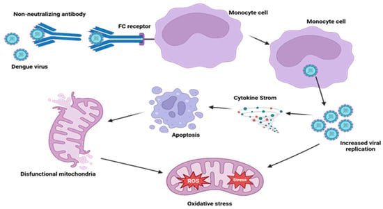 ADE induces mitochondrial dysfunction and inflammation in dengue-infected cells. DENV entry into monocytes is stimulated by non-neutralizing antibodies along with Fc receptor-mediated uptake, enhancing viral replication. This ensues cytokine storm, oxidative stress due to increased reactive oxygen species (ROS), and mitochondrial dysfunction that leads to apoptosis and once more triggers the inflammatory response, worsening disease severity.