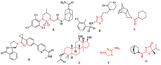 Structures of selected selective inhibitors of 11β-HSD1. (A) Compound with a sulfonamide moiety; (B) compound with a 2-aminothiazole scaffold; (C,D) compounds with an amide group; (E) compound based on the hexadecahydro-1H-cyclopenta[α]phenanthrene system; (F) compound with a 2-aminothiazol-4(5H)-one (pseudothiohydantoin) core; (G) AMG-221.