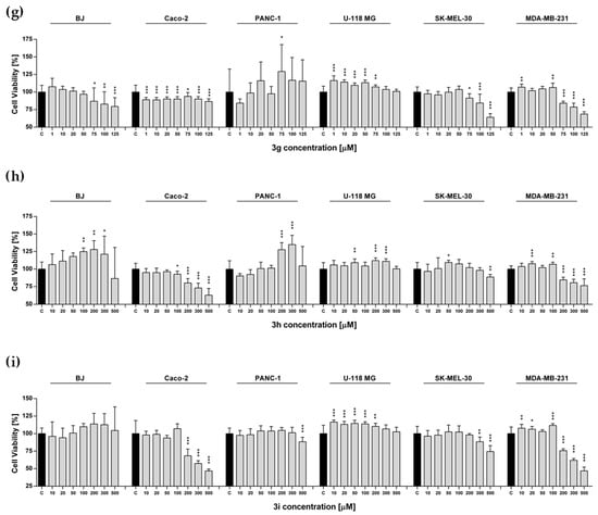 (a–i). Observed differences in metabolic activity in cancer and normal (BJ) cell lines exposed to compounds 3a–3i over a wide range of concentrations for 72 h. Cell viability was assessed using the MTS assay. Bars in the graphs represent the mean value and standard deviation, n = 8, *** p < 0.001, ** p < 0.01, * p < 0.05 (one-way analysis of variance and Dunnett’s a posteriori test).