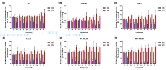 The levels of reactive oxygen species, reactive nitrogen species, and reduced glutathione (GSH) were measured for all experimental sets at a concentration of 500 µM/each. The highest increase in the level of the reactive oxygen species (ROS) was noted for the SK-MEL-30, Caco-2, and MDA-MB-231 lines. These findings demonstrate that the tested compounds exert pro-oxidant activity, a mechanism considered therapeutically advantageous in anticancer strategies. The associated increase in ROS production in these cell lines is likely to compromise cellular homeostasis and trigger apoptotic pathways. In detail, we observed an increase in ROS production for compounds 3a, 3b, 3e–3i in the case of Caco-2, for 3b, 3e–3i in the case of SK-MEL-30 cells, and 3e–3i in the case of MDA-MB-231. For the BJ line, we did not observe an increase in ROS, with the exception of compounds 3h and 3i (Figure 5).
