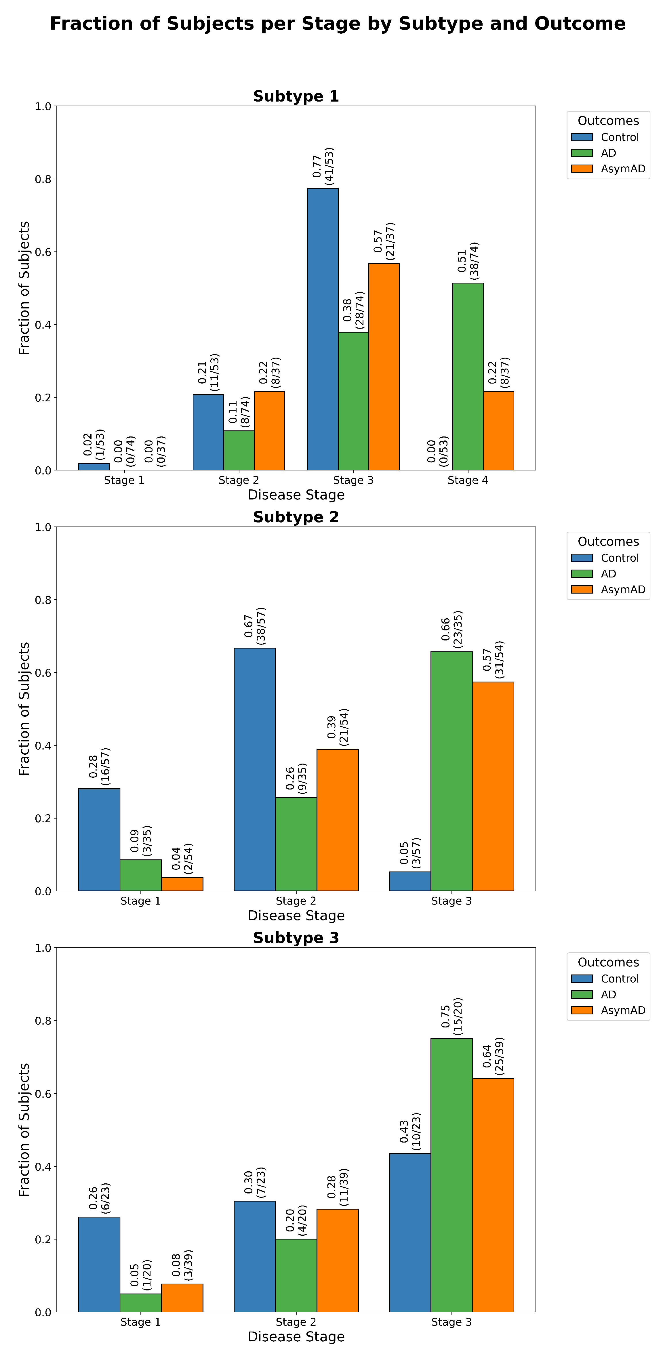 Chi-Squared Goodness-of-Fit Analysis of Stage Distributions in AD (EHBS Cohort, Inferred Subtypes). This table presents results from a goodness-of-fit analysis evaluating whether observed distributions of disease stages (Stages 1–4) deviate from a uniform distribution across three clinical outcome groups (N = 392)—cognitively normal (Control), asymptomatic AD (AsymAD), and symptomatic AD (AD)—within each of three neurodegenerative subtypes inferred from the EHBS cohort using the ReduXis pipeline. The subtypes, derived from imaging and biomarker features, correspond to: Subtype 1 (non-inflammatory, amyloid-driven AD), Subtype 2 (inflammatory AD), and Subtype 3 (tau-driven cortical atrophy AD). For each outcome–subtype pairing, the null hypothesis assumes uniform random stage assignment, with no structured enrichment. To correct for multiple comparisons across the three subtype-specific tests within each clinical outcome group, Bonferroni correction was applied by multiplying the nominal p-values by 3. All corrected p-values remain statistically significant, indicating that stage distributions within outcome groups are non-random and subtype-specific. A global test across all 9 subtype–outcome combinations yields a highly significant result ( = 382.31, df = 12, p = 2.096 × 10−74), providing strong evidence for structured stage stratification associated with both inferred subtype and clinical outcome.
