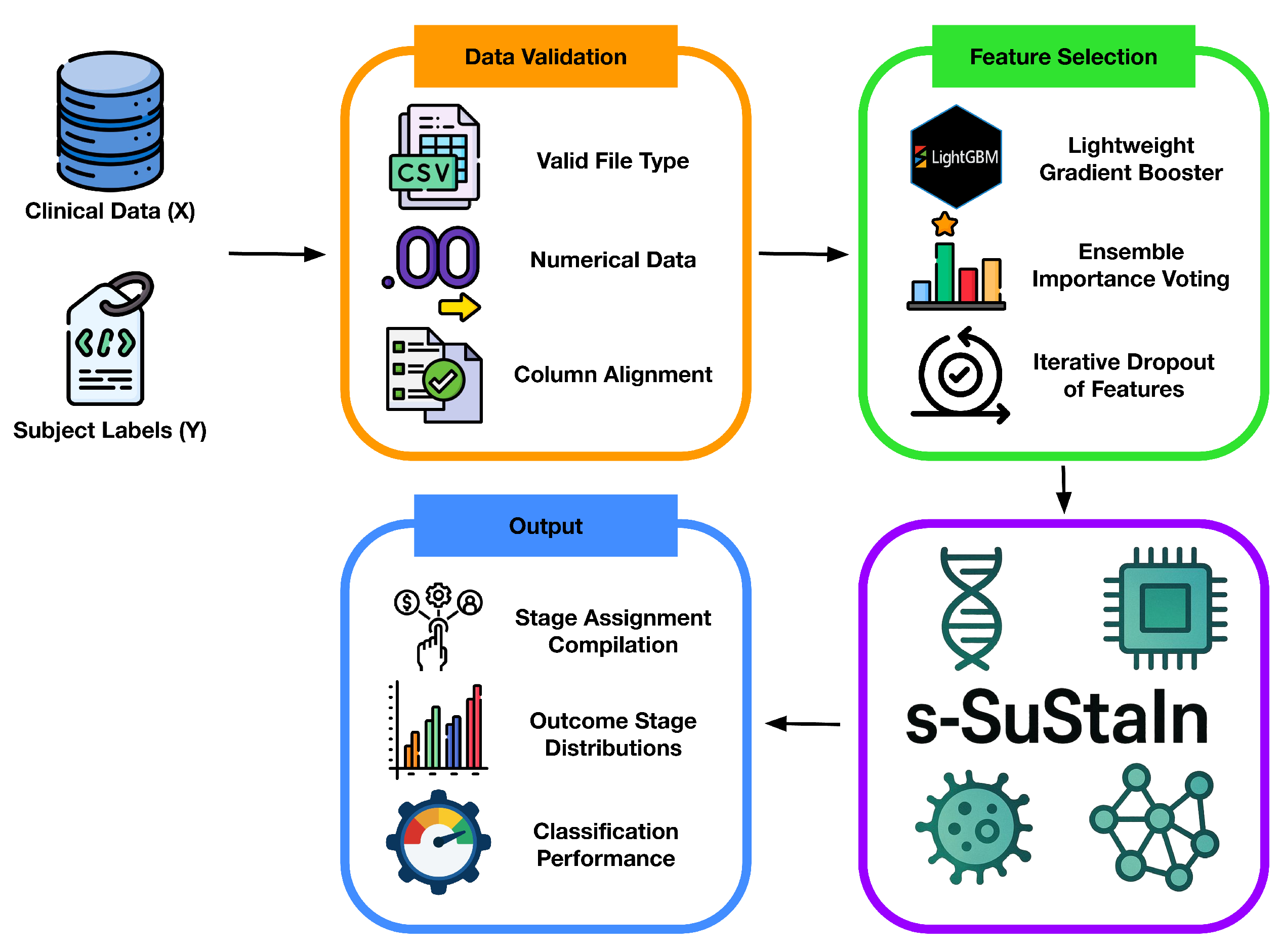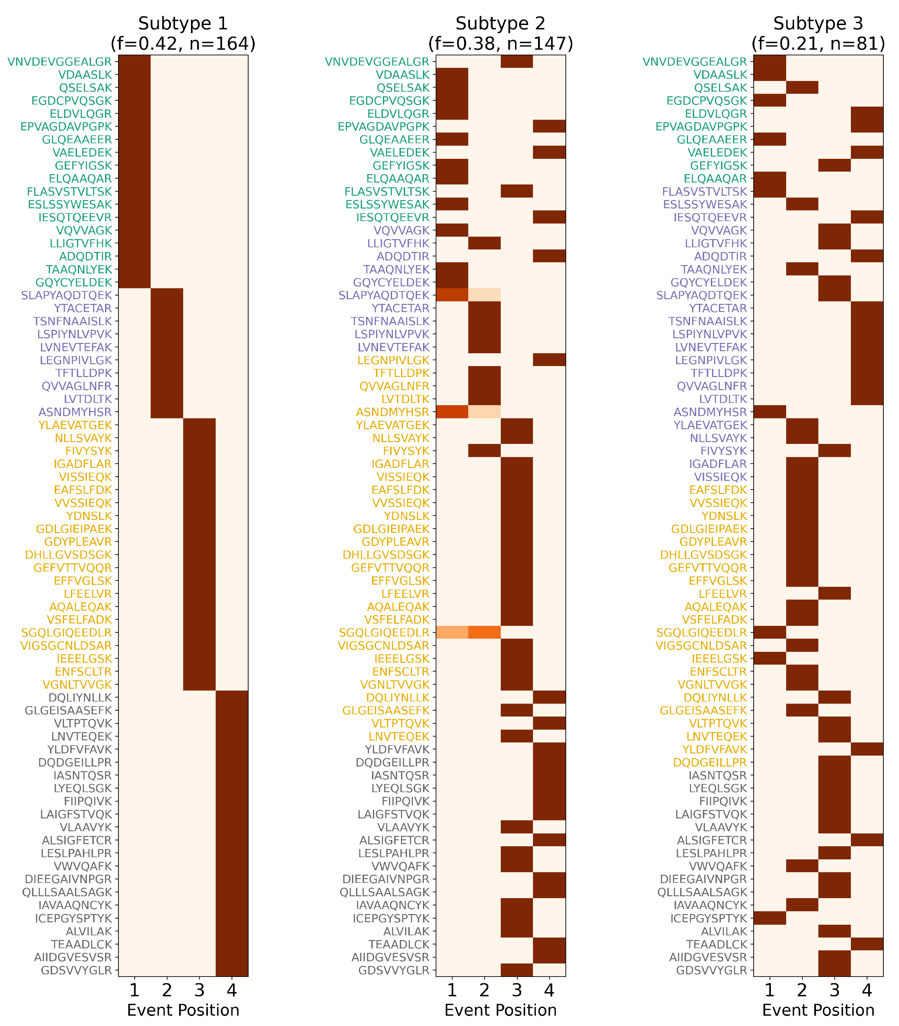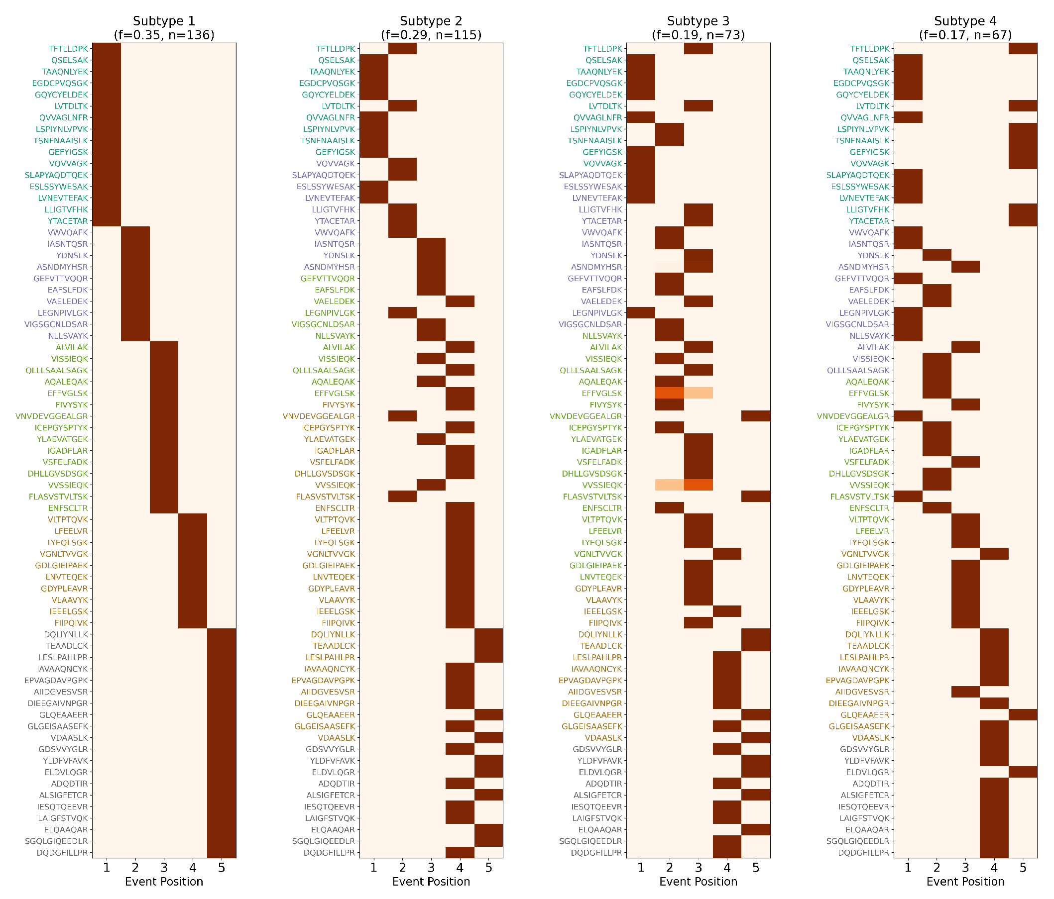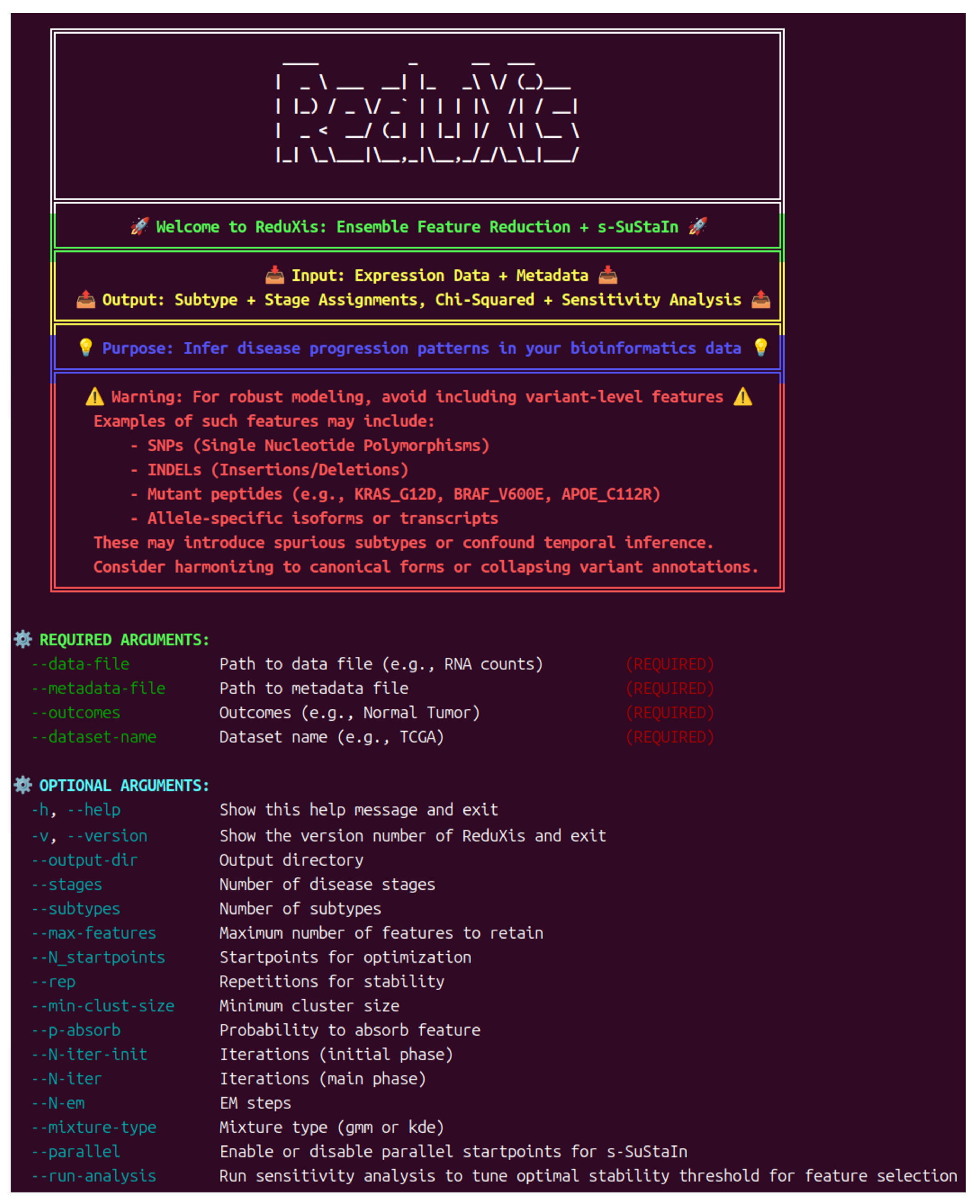 Figure 9, but differs critically in the user-specified parameters: here, s-SuStaIn was configured with 5 stages and 4 subtypes, as opposed to the more conservative 4 stages and 3 subtypes. This small increase in input flexibility leads to a disproportionately large impact on model interpretability and robustness. By forcing s-SuStaIn to distribute progression trajectories across more stages, the model is pressured to “stretch” its inference over finer-grained temporal resolution, leading to smaller and less coherent biomarker clusters. This makes individual stage transitions more susceptible to stochastic variation or noise, especially in subtypes with fewer represented subjects. In addition, with an extra inferred subtype, the algorithm searches for subtle trajectory differences that may not be biologically meaningful, increasing the risk of overfragmentation and false discovery. The resultant noisy patterns often reflect sparse subject assignment or forced separation of weakly supported signals, undermining biological interpretability. This stark contrast underscores the importance of domain expertise in selecting modeling parameters. Without careful input, automated modeling can easily generate visually complex but biologically ambiguous outputs, highlighting the need for informed constraint-setting in unsupervised discovery frameworks like ReduXis.