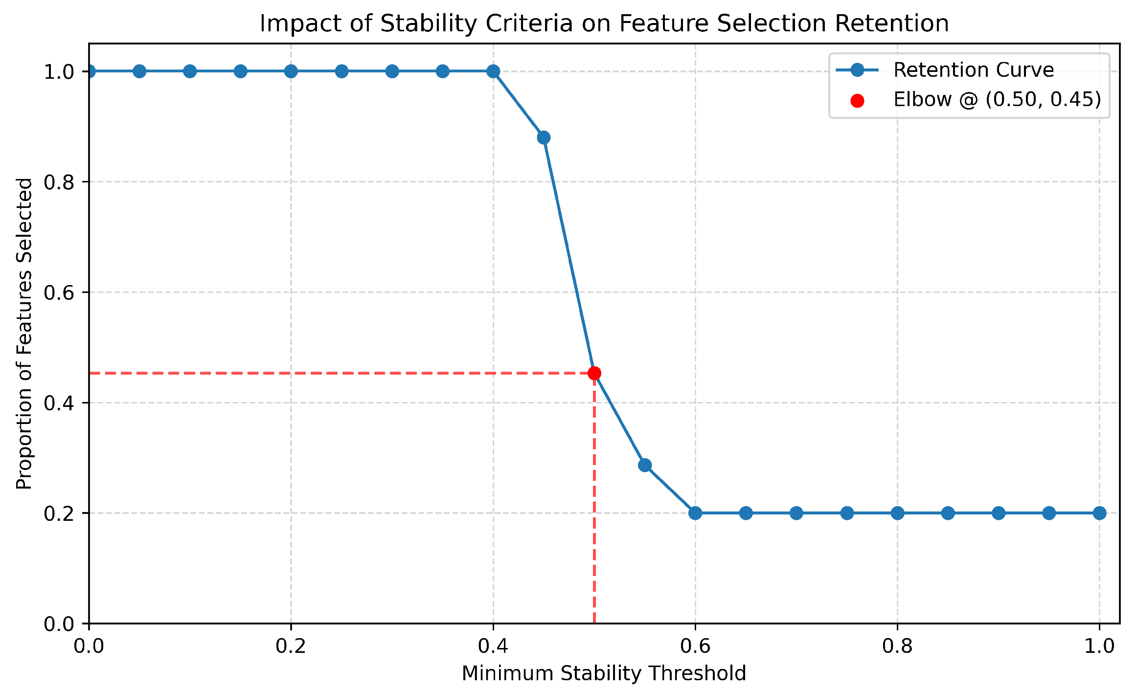 Determination of the optimal stability threshold for feature retention. This plot demonstrates how the number of retained features varies as a function of the minimum stability threshold. Rather than evaluating model performance (e.g., sensitivity or specificity), the focus here is on identifying a threshold that balances feature robustness with inclusion rate. Using an elbow-point heuristic, we locate a threshold—specifically, 0.5—where the rate of change in retained features () significantly shifts. Thresholds below this point retain too many unstable features (overly permissive), while thresholds above become overly restrictive, excluding potentially informative variables. The selected threshold thus represents a principled compromise for robust downstream analysis.