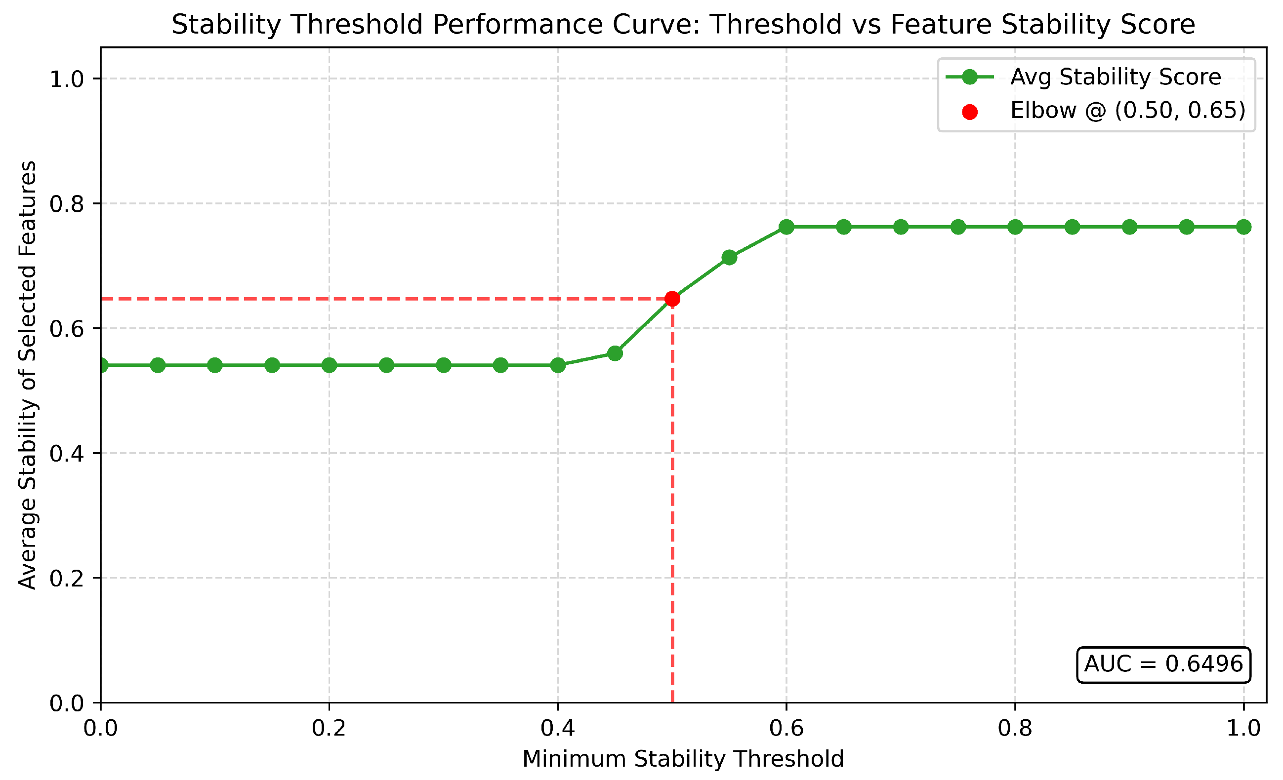 Figure A3, an inflection point or “elbow” is again observed at a threshold of 0.5, reinforcing its selection as an optimal trade-off between retaining too many unstable features and applying overly strict filtering. Notably, the average stability score also peaks in curvature at this threshold, adding further confidence. Additionally, the minimum stability remains above 0.5 across all thresholds (AUC = 0.6495), suggesting that the dataset is inherently robust and relatively insensitive to extreme thresholding. This dual-figure approach provides both exploratory and confirmatory support for the chosen parameter.