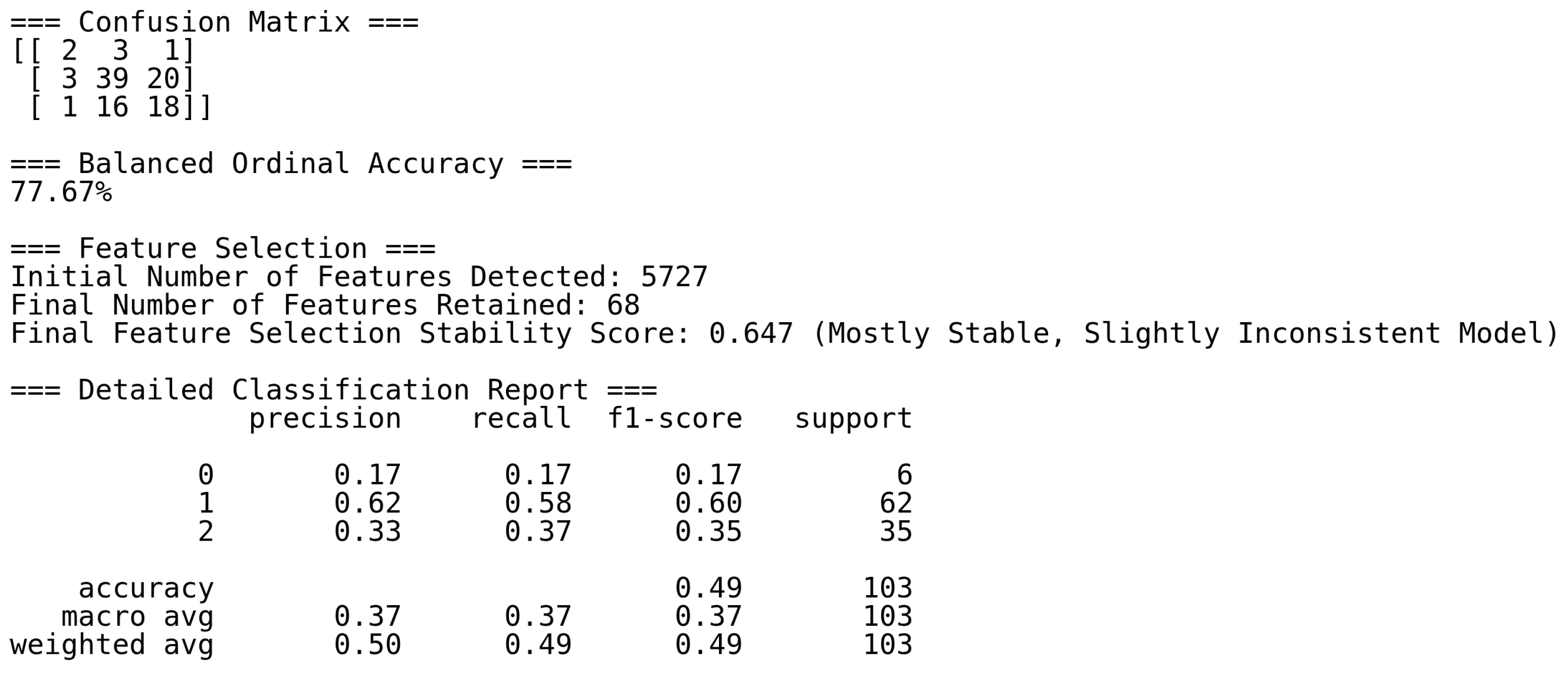 Automated classification report for the TCGA transitional cell carcinoma dataset. This report summarizes key performance metrics—precision, recall, F1-score, accuracy, support, and mean feature stability score—across all classes. Although the overall ordinal classification accuracy reaches 78%, performance is disproportionately driven by the majority classes. The “Localized” class (n = 19) is poorly detected, and confusion between the “Localized” and “Invasive” (n = 207) classes reflects both overlapping feature space and severe class imbalance. Notably, class weighting and resampling techniques were already applied, indicating that this result represents the upper bound of achievable performance under current data constraints. These challenges underscore the difficulty of modeling minority classes in high-dimensional, low-sample-size contexts. Nonetheless, the robustness of the ReduXis pipeline—including ensemble-based feature selection and gradient-boosted decision trees—enables consistent performance across multiple datasets, even under such stringent conditions.