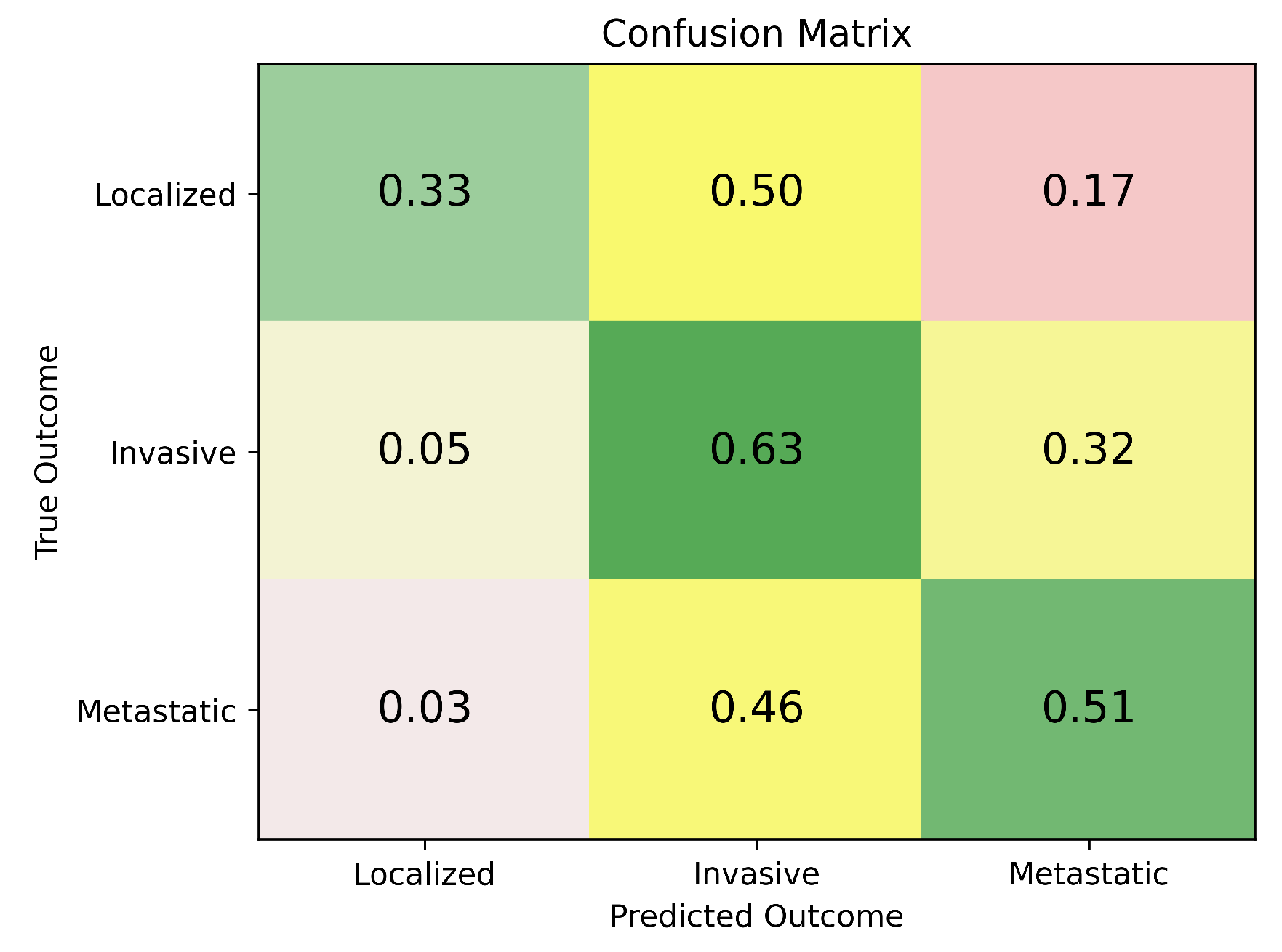 Normalized confusion matrix for the TCGA transitional cell carcinoma dataset. This figure visualizes ReduXis’ prediction accuracy across TCC histological grades (Localized: n = 19, Invasive: n = 207, Metastatic: n = 117), with values normalized to the [0, 1] range. Diagonal cells represent correct classifications, while off-diagonal cells capture misclassifications. Darker green shades indicate high confidence and correct predictions, yellow shades signify near-misses—where the predicted class was close to the actual label—and red shades highlight more substantial classification errors, where predictions diverged significantly from the ground truth. Unlike traditional accuracy metrics, balanced ordinal accuracy accounts for class imbalance by weighting performance by the frequency of each class, and assigns partial credit for predictions that are closer in ordinal space to the true class (e.g., misclassifying a high-grade tumor as medium-grade is penalized less than predicting it as low-grade). Together with