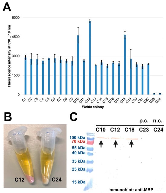 Although several attempts were undertaken to produce OsAPSE in the eukaryotic host P. pastoris (Table 1), most experiments did not yield production of the POI. However, the GH27 domain of OsAPSE, in combination with an N-terminal MBP tag, TEV protease site and mCherry RFP reporter tag, combined with a C-terminal His6 tag, was successfully produced (experiment 32). A total of 22 putatively transformed Pichia colonies were cultivated, and protein synthesis was induced. Afterwards, red fluorescence intensity was measured for every culture (Figure 2A) and was obvious in cultures C10, C12 and C18.