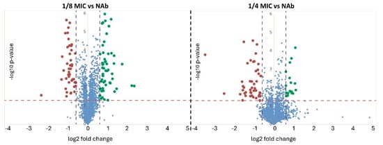 A total of 19,424 peptides and 2910 proteins were detected, corresponding to 54.9% of the proteins encoded by strain CCUG 70747. The sample preparation and digestion strategy allowed the analysis of the whole cell proteome. However, membrane proteins may be underrepresented due to their hydrophobic nature. The difference in protein abundance (higher or lower) was calculated by comparing each protein’s abundance under each condition to its abundance without antibiotic (NAb) exposure to calculate the fold change (FC). A significant difference in abundance was considered if the FC was equal to or higher than 1.5 for higher abundance, and equal to or lower than −1.5 for lower abundance. Only results with a p-value ≤ 0.05 (Welch’s t-test) were considered (File S1). According to this, the maximum number of proteins detected with significant differential abundance were 87 (1/4 MIC vs. NAb) and 61 (1/8 MIC vs. NAb) and overall, more proteins were overexpressed for both concentrations of antibiotics when compared with NAb (Table 1). When 1/4 MIC is compared with 1/8 MIC, only six proteins had significantly higher abundance (File S1).