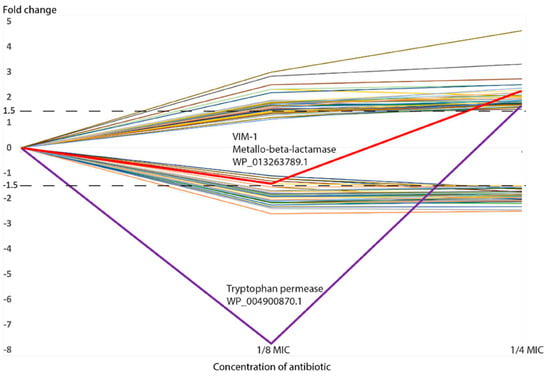 Volcano plots were generated, showing the evolution of the differential abundance going from 1/8 MIC to 1/4 MIC (Figure 1). In general, there was an increase in the number of proteins passing the set thresholds, the overall FCs, and the statistical significance when going from 1/8 MIC to 1/4 MIC. Regarding proteins demonstrating significant differential abundance (passing threshold of ±1.5 FC and p-value ≤ 0.05), most proteins were showing a consistent trend when observing both sub-MICs versus NAb, displaying either an increasing or decreasing trend in their abundance as the concentration of antibiotic increases (Table 2 and Table 3 and Figure 2). However, two proteins do not follow this pattern and show a lower abundance at 1/8 MIC and then a higher abundance at 1/4 MIC (Table 2, Figure 2): one is VIM-1 (WP_013263789.1, a subclass B1 metallo-beta-lactamase); and the other is a tryptophan permease (WP_004900870.1), which has also been proposed to play a role in antibiotic resistance []. The trends of all differentially expressed proteins were represented in Figure 2, clearly showing the different trends of these two proteins with respect to the others.