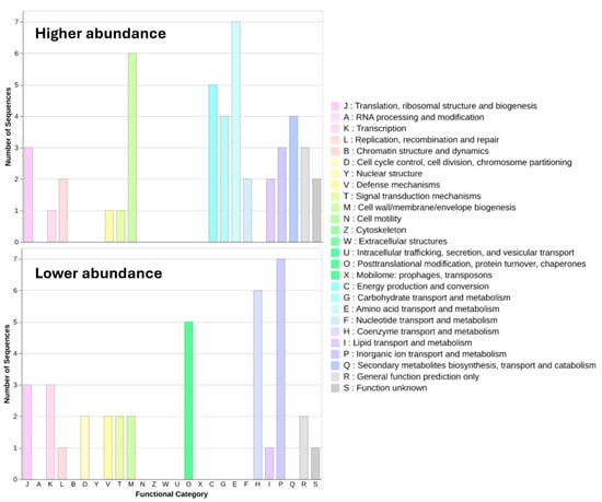 The proteins displaying significant differential abundance levels at the highest concentration used (Table 2 and Table 3) were functionally classified, using the cluster of orthologous groups (COG) database [] (Table S3, Figure 3), to determine which functional categories were the most affected in each case. The two most represented categories were “Inorganic ion transport and metabolism” (P) and “Function unknown” (S), with 11 and 10 differentially expressed proteins, respectively (Figure 3).